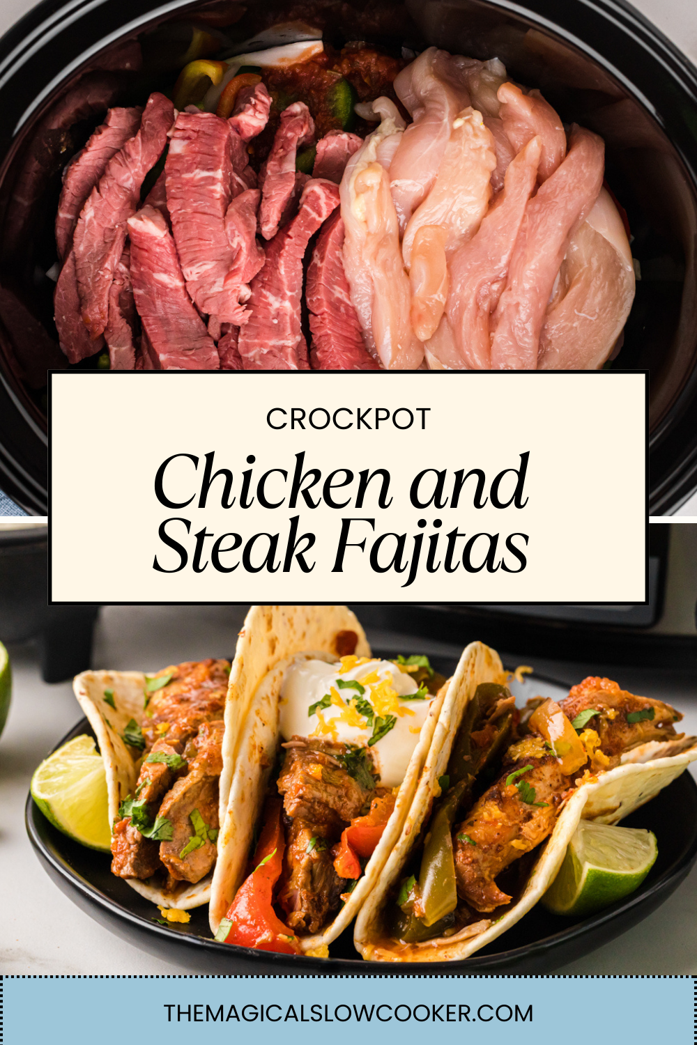 You can make Chicken and Steak Fajitas at the same time in the crockpot! Has a great sauce and plenty of onions and bell peppers.